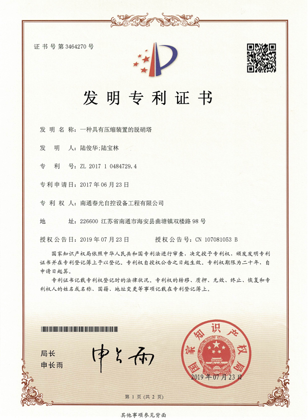 安裝有囊式壓縮裝置的脫銷塔專利證書